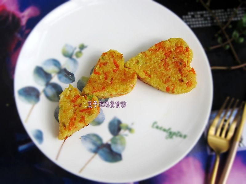 4:小米饭趁热吃香味很浓,做鸡蛋饼的小米饭冷、热均可,我用的是放凉的小米饭。胡萝卜去皮洗净切碎,青椒切小丁。
