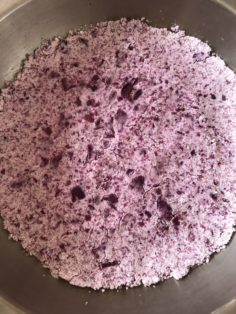 2:分次加入紫薯泥,用手搓匀,最后大米粉成为用手可以攥成团,再轻轻一压就会散开的状态。我大约放了150克紫薯泥。
