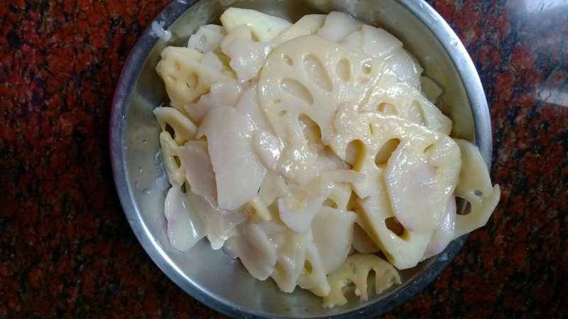 1:把买回来的莲藕和淮山洗干净切成片,然后放到开水锅里焯熟莲藕淮山!热油锅,把莲藕淮山倒入炒锅,快速爆炒!