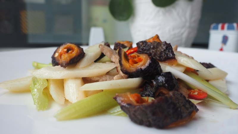 2:海参放到油锅煸炒,把料酒,海鲜酱油,蚝油,放山药一起煸炒3分钟。