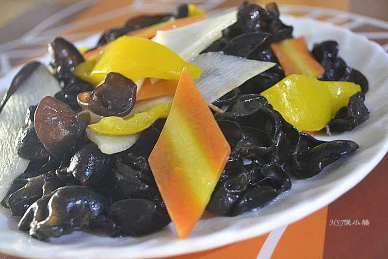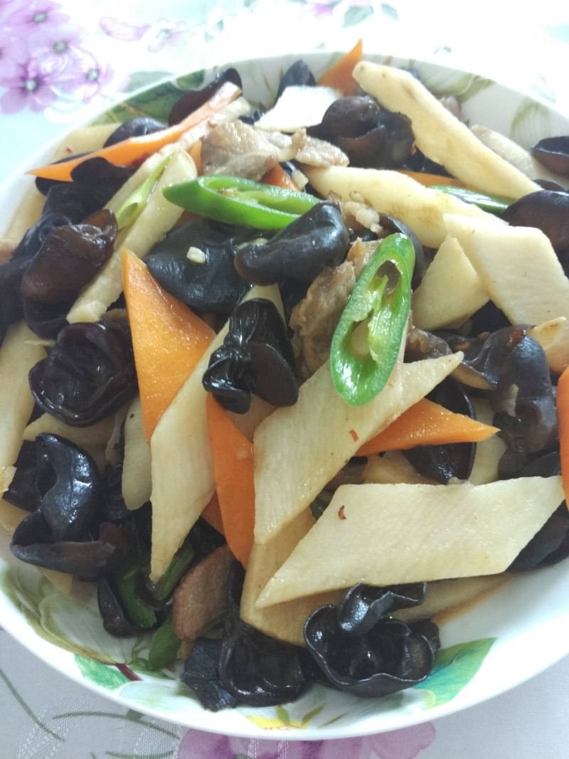 1:泡好的木耳,淮山,胡萝卜,青蒜,尖椒