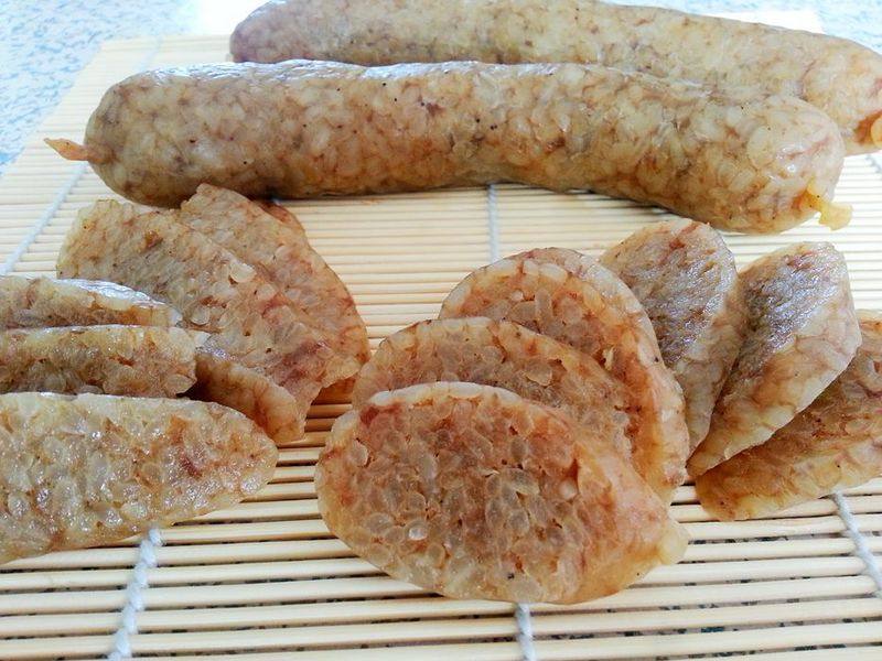7:依次灌好的糯米肠。(米肠千万不要灌的太满,七八分满就可以,要不在蒸的时候就爆裂。)