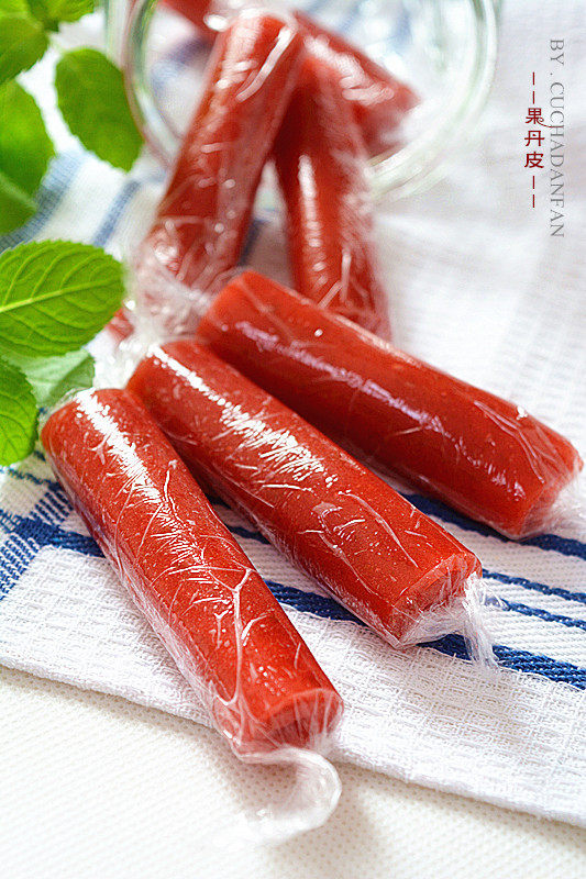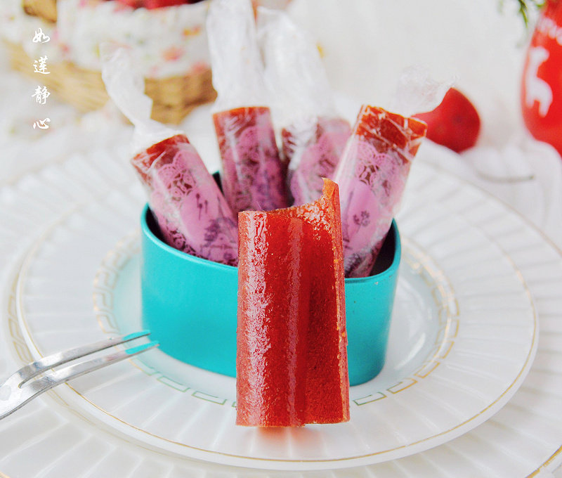 12:用利刀将其切成长短一致的山楂卷;卷得粗一点、切得短一点就是山楂卷;卷得细一点,切得长一点就是果丹皮,总之,都是这么做出来的;有食品包装纸将其包起来或者用保鲜盒装起来,冰箱冷藏保存,随吃随取,可以保存一两个月不变质。