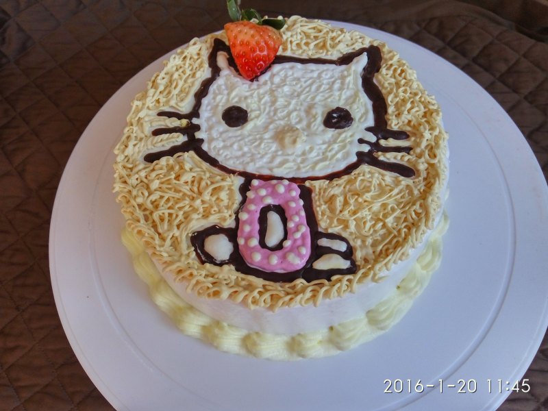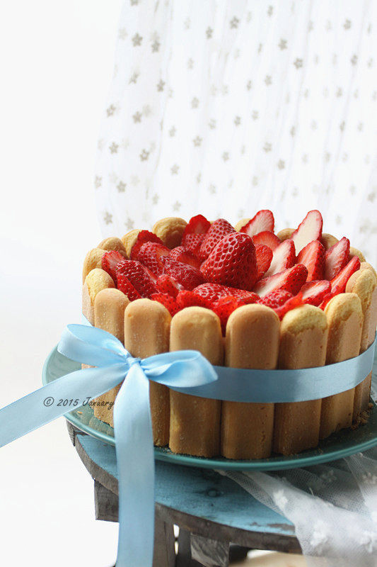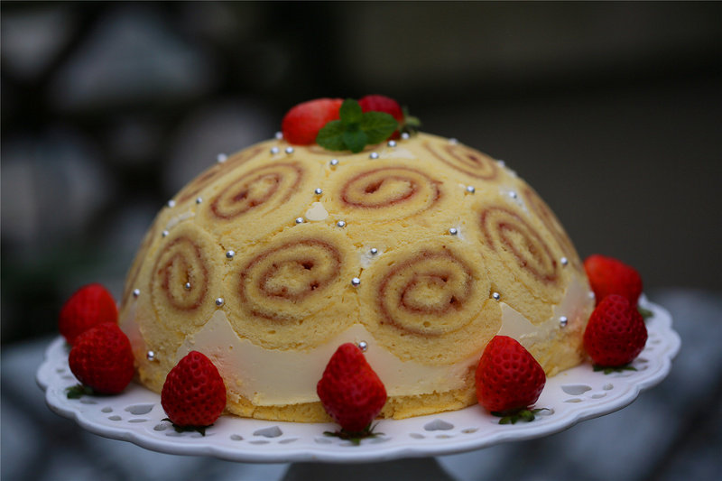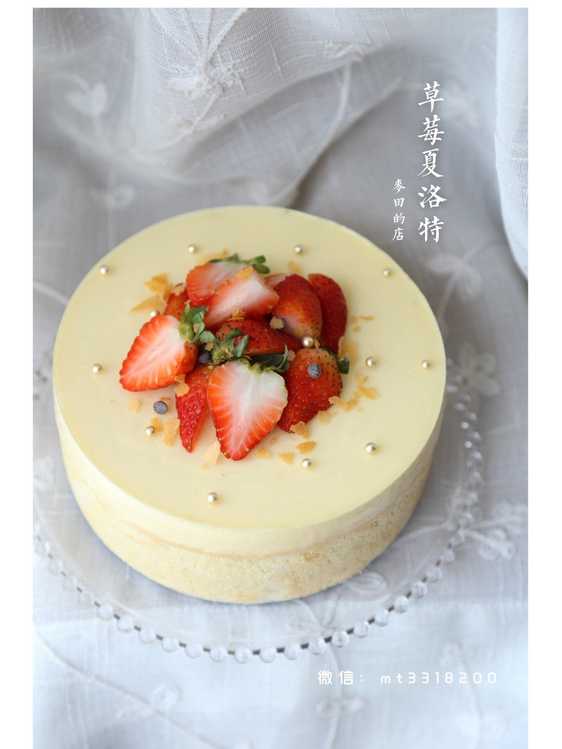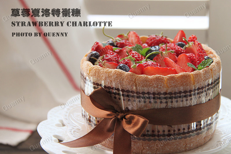28:脱模的时候用吹风筒或热毛巾稍稍加热模具上部,就能把蛋糕脱出来。加上草莓装饰。整个蛋糕完成啦