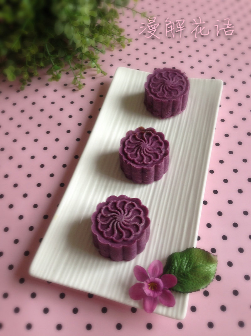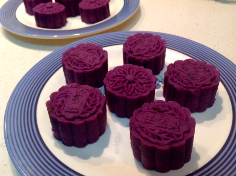 3:把包成的紫薯球放入50g的月饼磨具,模具里稍稍擦点油,用力向下按压,提起模具就成