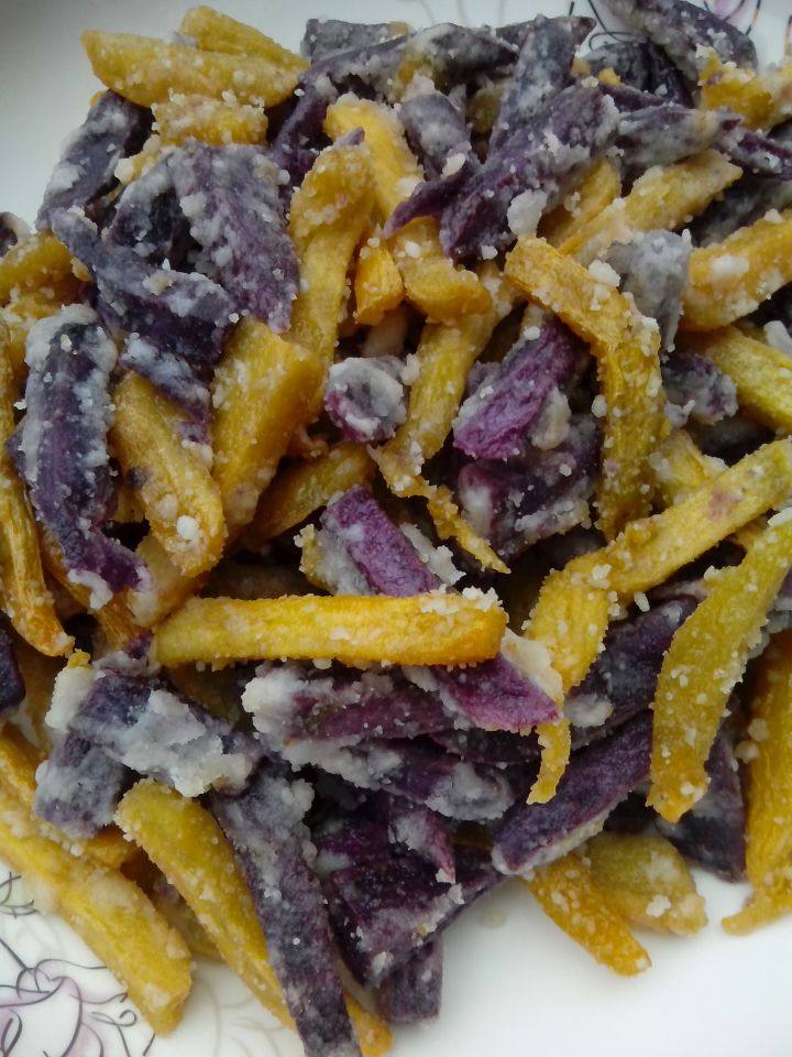 1:把紫、红薯去皮,切条状,用水洗去表面淀粉,炸的时候不会粘锅。