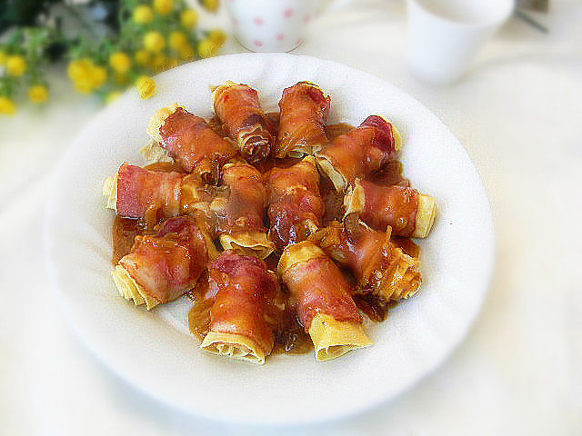 9:均匀地浇到摆好盘的培根卷上即可。