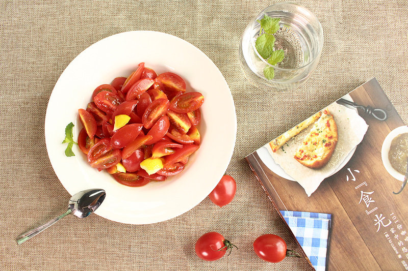 4:将适量油醋汁倒在蕃茄上,搅拌均匀。当然,我喜欢加点柠檬,美观,酸爽又带劲