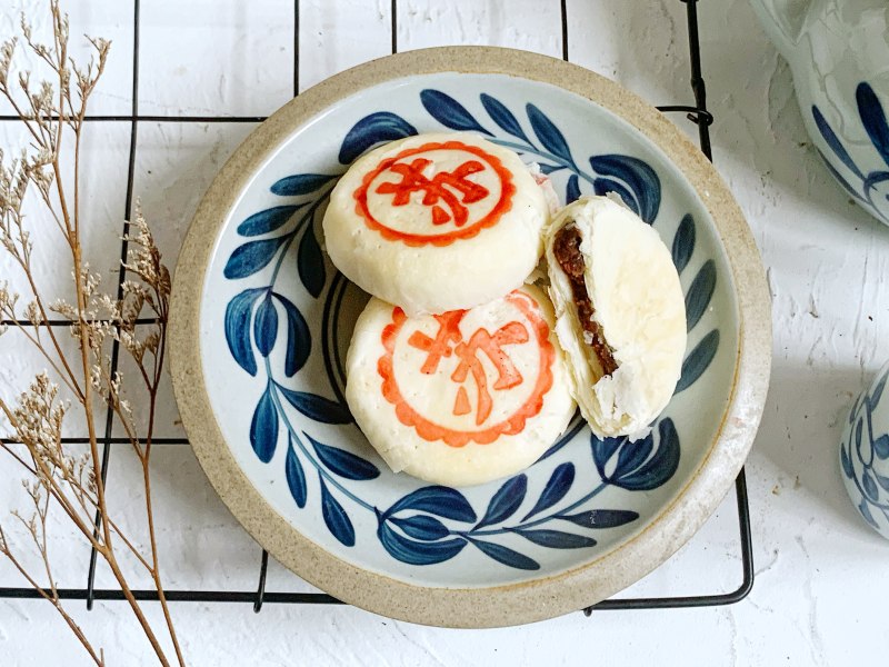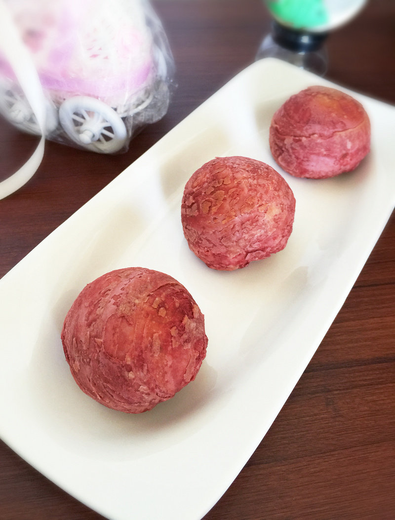 20:红丝绒色素加少许水调匀,用月饼印章蘸食用色素盖在饼皮表面。