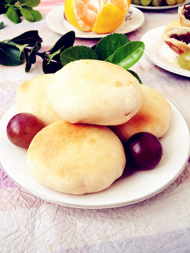 1:准备食材:制作食材:高筋粉240克,糖25克,酵母2克,盐2克,鸡蛋液30克,清水55克,牛奶55克,黄油20克,自制豆沙馅200克,飞饼2张。