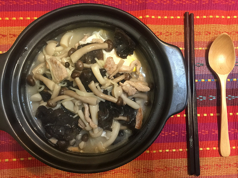 14:简单描述:泡发木耳,洗净蟹味菇;肉切丝,黄酒食盐;热锅放葱姜细丝放肉翻炒;放蟹味菇、木耳和热水,水高于蘑菇;开过煮面,卧鸡蛋,放盐;碗内放白胡椒和香油。盛出即食即可。