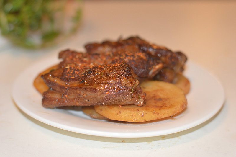 3:烤盘放油纸,摆入土豆片,然后摆羊排。