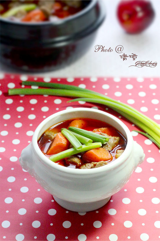 1.胡萝卜可以适量多加点。因为胡萝卜虽然花了短短的时间参与,却已吸取羊肉汤的精华,鲜美无比,软绵有余。2.这锅汤羊肉的量很大,鲜味就是亮点。所以加味精只是锦上添花。而且我平时做菜也没有用味精的习惯,大多借助其他食物来提鲜。况且现在好多调料本身也都含味精,没有必要再重复加。3.羊肉量最好大些,这样汤才会浓郁。我之前也试过加一半的羊肉,汤的鲜美大打折扣。所以我还是果断加了这么多的羊肉。到最后,汤都喝完了,胡萝卜都吃完了,剩下多多的羊肉,第二天红烧了。。。4.这边很难找到大青蒜,找到了也价格不菲,和羊肉同价。所以我用大葱代替了大青蒜。如果有大青蒜的话就最好了。5.第11步中的胡萝卜不要煮太烂,因为最后加了上汤还要煮一小会入味。6.如果觉得过程太繁琐,可以省去12步之后的步骤。在第11步加胡萝卜的时候一同加上汤,将羊肉和胡萝卜煮烂即可。只是本人觉得味道会差点。7.李锦记的麻辣火锅上汤很赞。它在减轻羊肉的膻味方面表现突出,在成就汤的鲜美方面也功不可没。