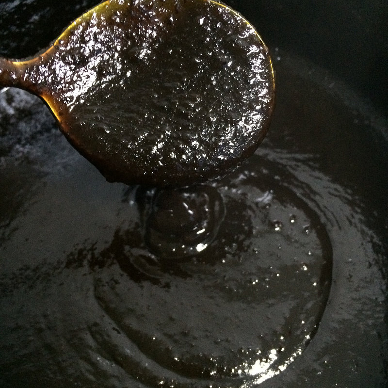 4:熬阿胶:中火,倒入黄酒和泡好的阿胶和打粉的老冰糖煮沸后改小火,用木勺不断搅拌30分钟直至挂旗。亲们仔细看我家的挂旗,真正的东阿正品阿胶才能熬出这种血红色的胶来!