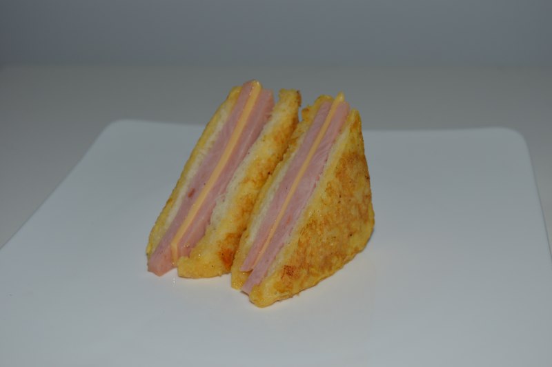 3:先将三明治做好:按面包-火腿-芝士-火腿-面包的顺序放好,然后将做好的三明治的每一面都在蛋液中浸湿(侧面也要),让蛋液完全包裹上面包。