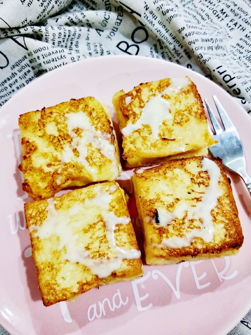 8:把抹好花生酱的面包在鸡蛋,在鸡蛋液里打个滚。锅里油烧热,把面包放下去,全程小火煎制至两面金黄即可出锅,淋上炼乳可以上桌了!