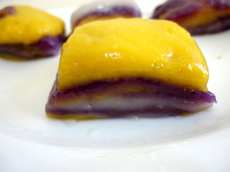 8:可在上面铺一层米粉,颜色可随自己的喜欢;只要能分出层次来就可以,米粉上再撒适量干桂花,盖盖子蒸1-2分钟。