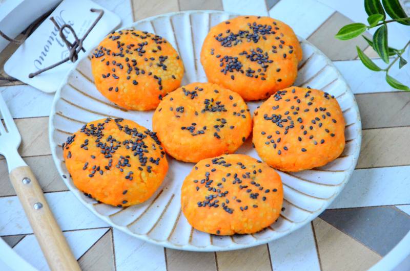 7:挖上一勺小米红薯泥,搓圆后稍稍按扁表面撒上黑芝麻。
