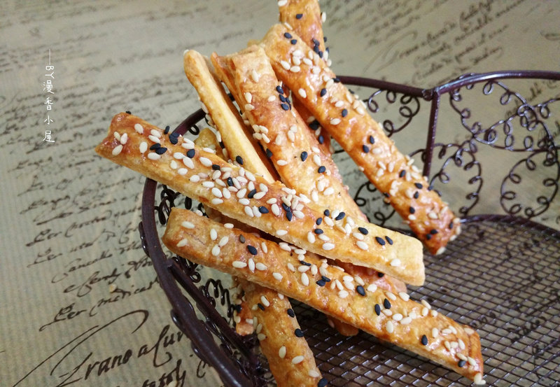 8:整齐排到烤盘上,蛋黄打散后加一点水再打匀,在饼干表面刷一层蛋黄液,再撒上芝麻,烤箱175度约25-30分钟,烤好后不取出,在烤箱里至凉再取出。烤好的饼干是硬脆口感,如果还是软的,可再回炉用150度再烤几分钟至完全变硬脆。密封保存尽快吃完。