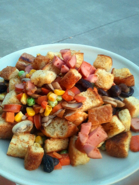 9:加入面包丁,少许盐、黑胡椒炒匀即可