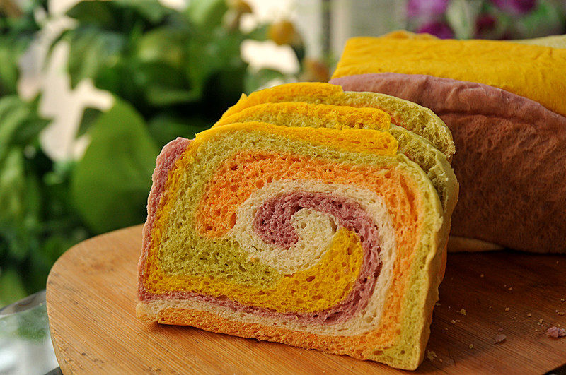 1、每种蔬菜泥的含水量不同,所以在揉面的时候,要根据手感,调节水的多少,尽量让五种面团软硬一致,有利于最后的造型美观。2、由于五种面团分别揉需要的时间比较长,所以每揉好一个面团都要用保鲜袋装好,放入冰箱冷藏,以免发酵程度不一样,影响最后的造型。3、把面团放入烤箱,在烤盘下面放一碗开水,制造一个温湿度都比较理想的发酵环境,这样面团能发酵得更好更快。如果烤箱带有发酵的功能更好。4、第一次发酵的时候,要把装着面团的保鲜袋开口稍微打开一点,留出发酵的空余。5、二发好的面团不要再翻动,以免影响成型的美观哦。6、本次方子使用的是450克的土司模。