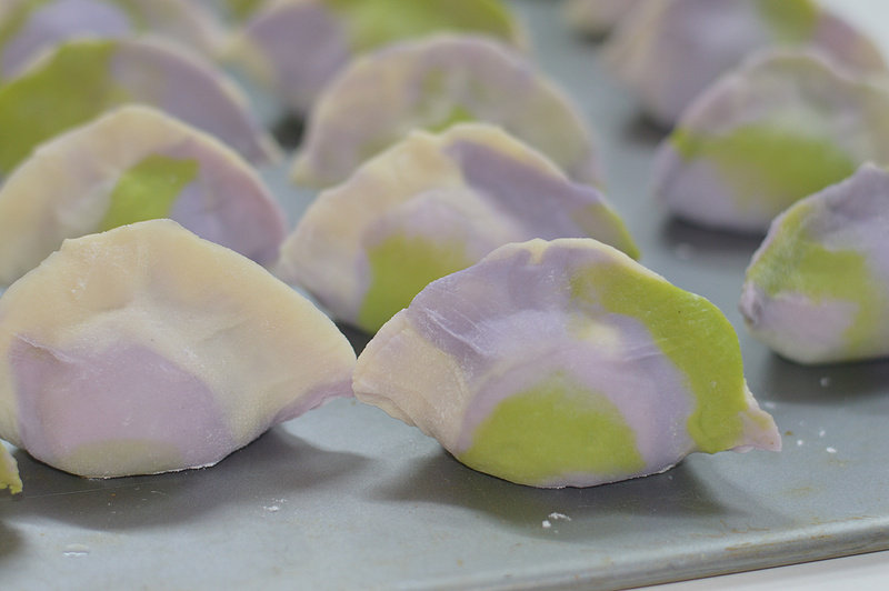面粉适量;菠菜适量;紫甘蓝适量;饺子馅适量;水适量;