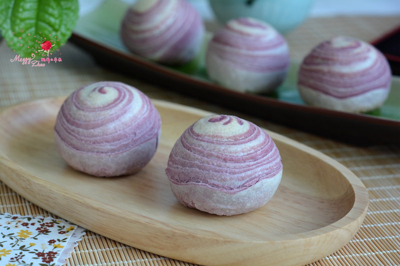 26:一共18个紫薯酥皮,封口朝下放在不粘烤盘上,看,美丽的花纹一圈圈