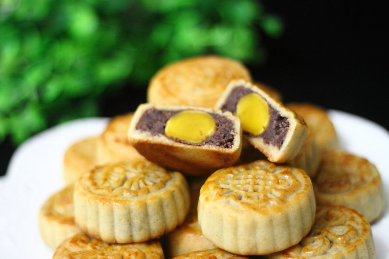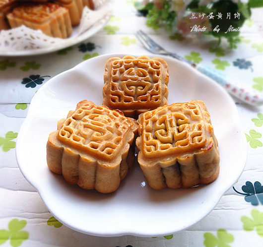 10:冷却蛋黄时,将自制的红豆沙按每个重20克分好,共18个