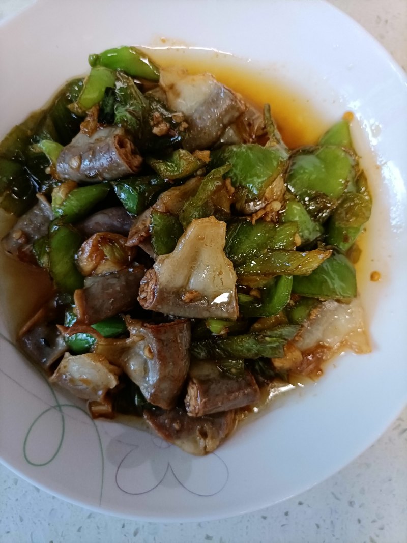 7:倒入青椒炒至断生出锅前放鸡精味精调味。