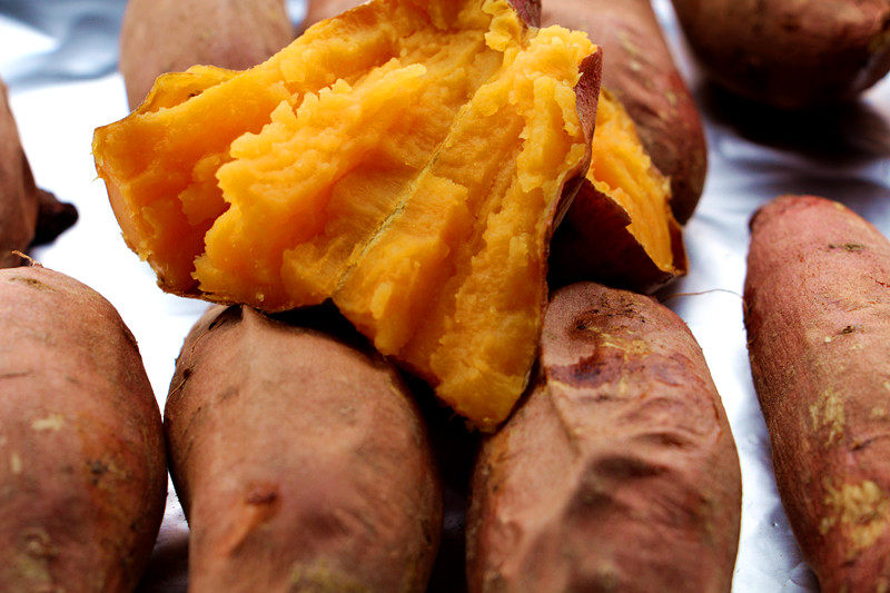 1:红薯数个。洗干净后,用厨房纸巾擦干表面水份。然后放在铺有锡纸的烤盘中,200度、上下火烤半个时。