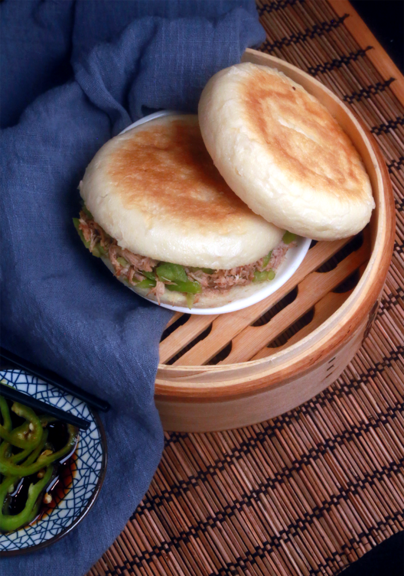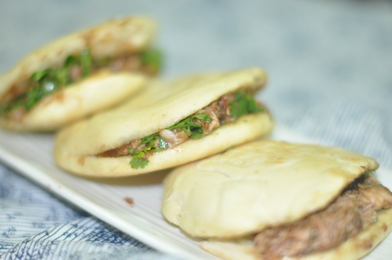 8:把拌好的蘸料放在发面饼中间,肉夹馍就做好啦。