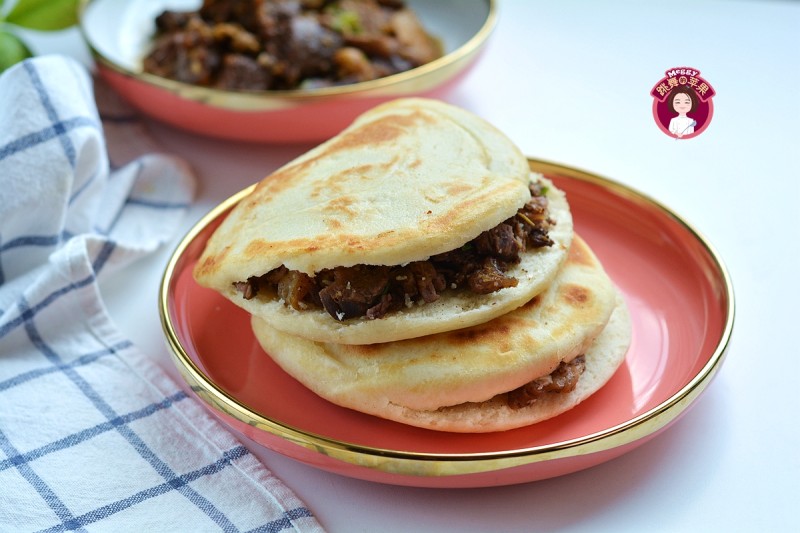 16:用小火将馍煎至两面金黄即可盛出。将馍对半切,夹入卤肉即可。