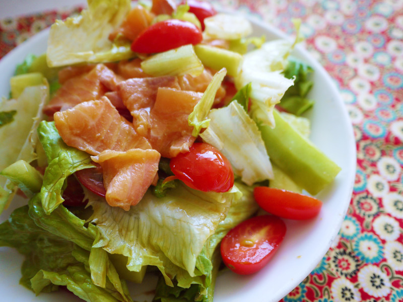 3:把西生菜、牛油果、圣女果、虾,加入芝麻酱搅拌,放入盘中,最后三文鱼卷成花状放在沙拉上,完成。