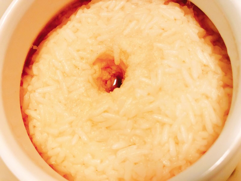 7:拌好的米放入容器中,压实,中间留一个洞洞。
