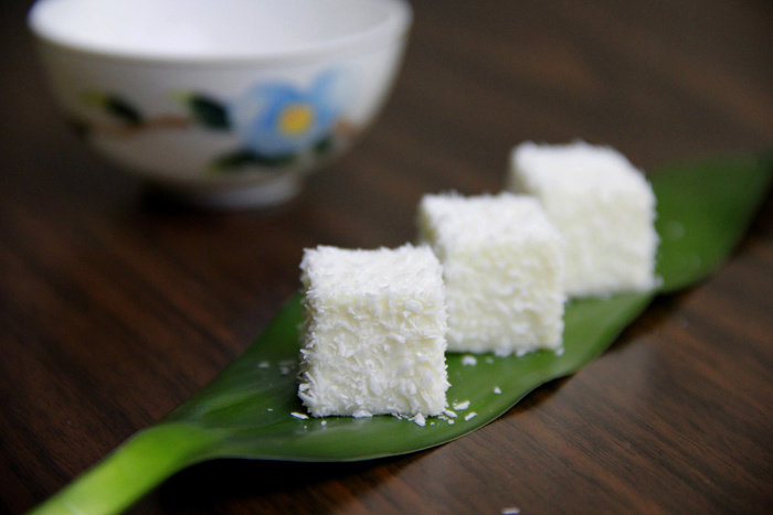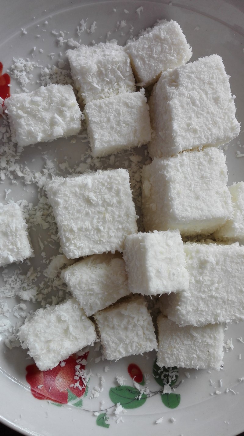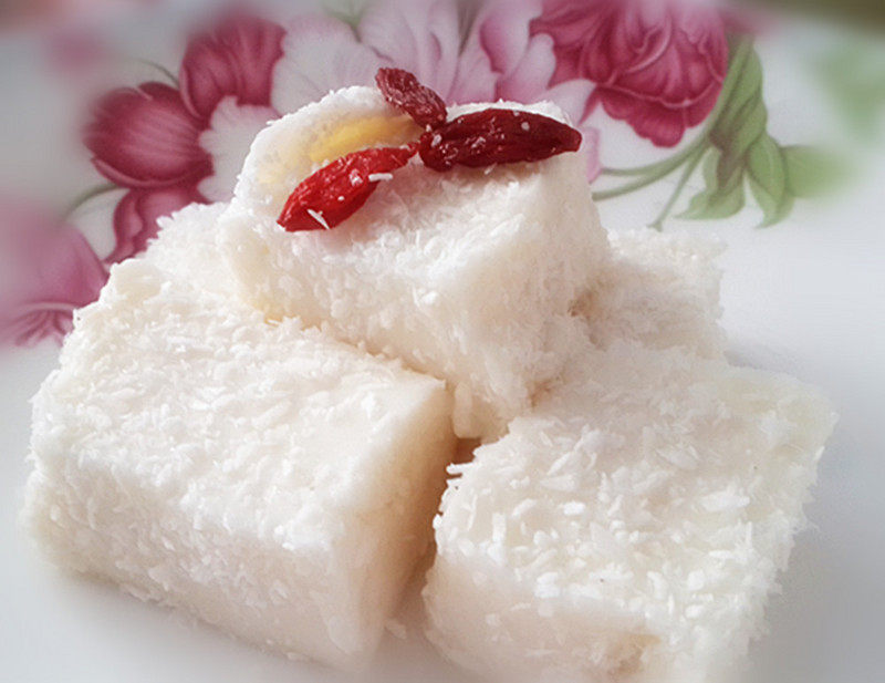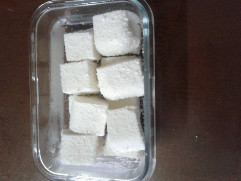 4:奶液待凝固后,取出脱摸,切成块状,蘸上椰蓉再放回冰箱冷藏,即可成品。