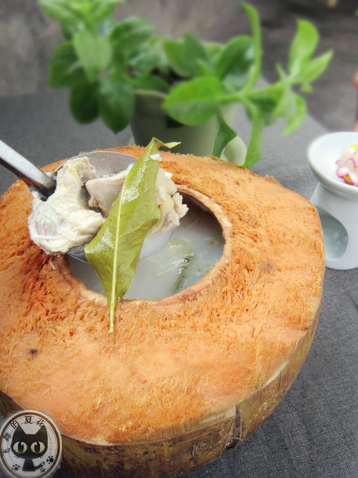 4:将汆烫过的鸡肉、姜、椰肉、柠檬叶、盐、鱼露装入椰壳中,倒入椰汁,椰子开口处封上保鲜膜,入锅大火蒸1小时即可