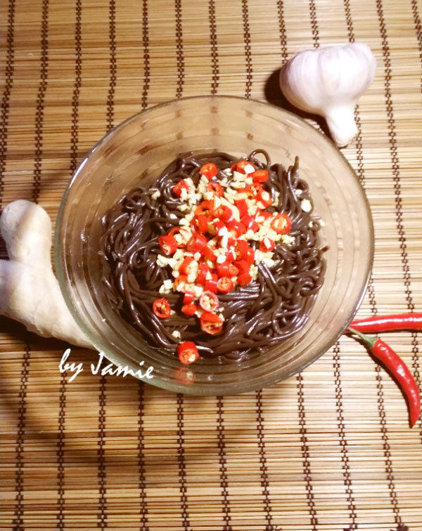 干厥根粉要先用水浸泡,泡软后用热水焯一下。制作蒜油的时候,要掌握好火候,要用小火慢炸,辣椒容易糊。
