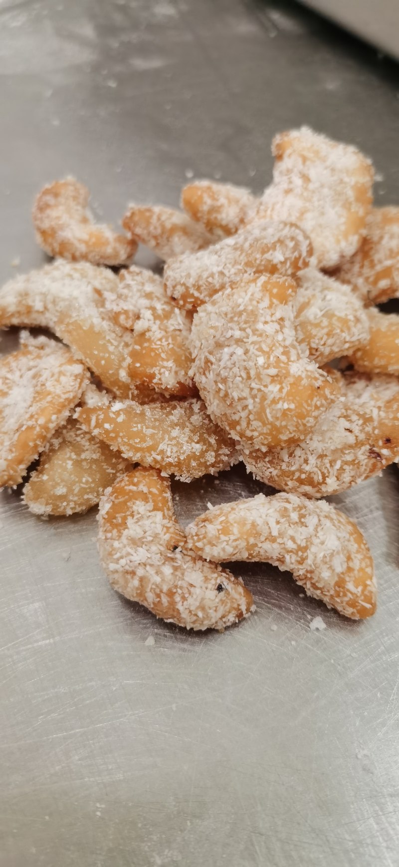 10:然后再捞出来,裹上炒熟的面粉,我这里偷了个懒,直接裹上之前剩下的椰蓉。