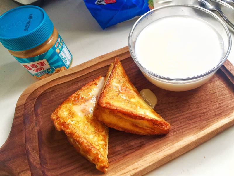 1:吐司一片,按顺序涂花生酱,铺香蕉片,涂炼奶,铺芝士片盖上另一片吐司