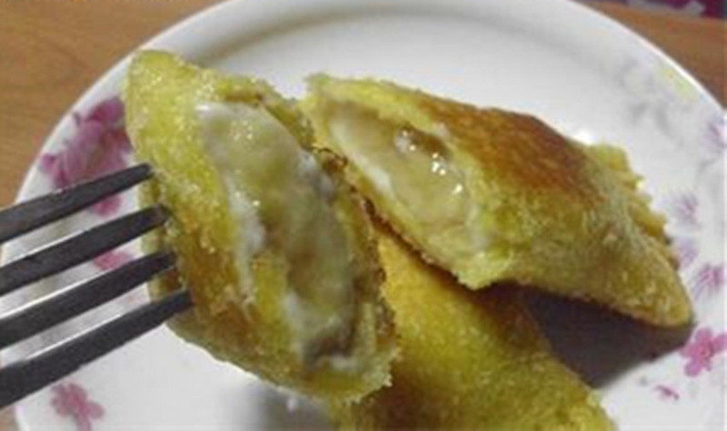 4:香蕉卷在蛋黄中蘸一下,放入锅里