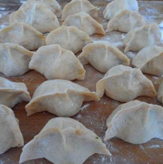 9:将馅料放在饺子皮中,包成您喜欢的饺子形状。