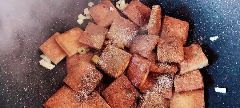 3.加入豆干翻炒:将切好的豆干块放入锅中翻炒,煸炒至两面金黄色,表皮微微干焦。