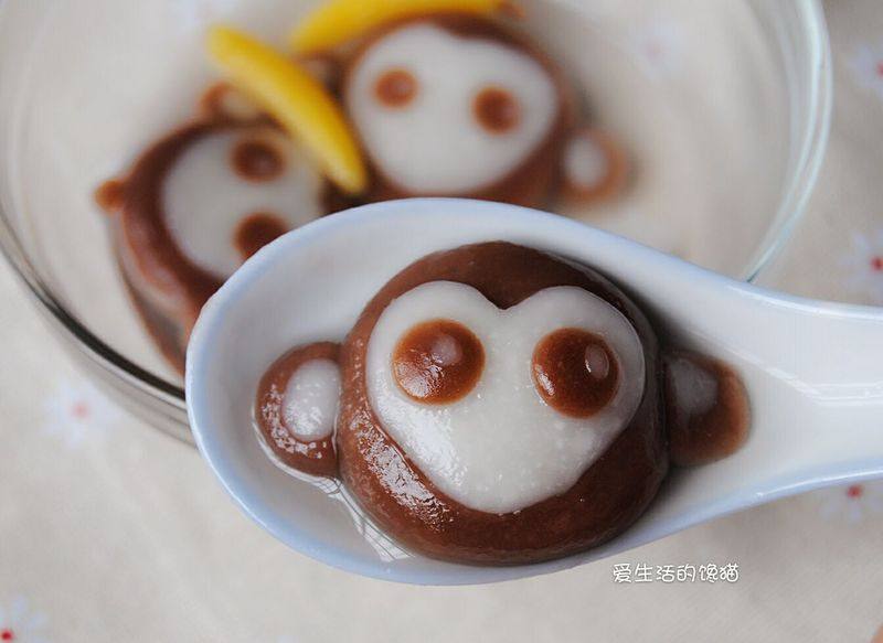 16:剩下的两个可可面团压扁,把小的白面团压扁贴在上面做耳朵,再沾点水组合在猴头上,取两个芝麻大小的面团压在猴眼睛上做眼睛的着光点
