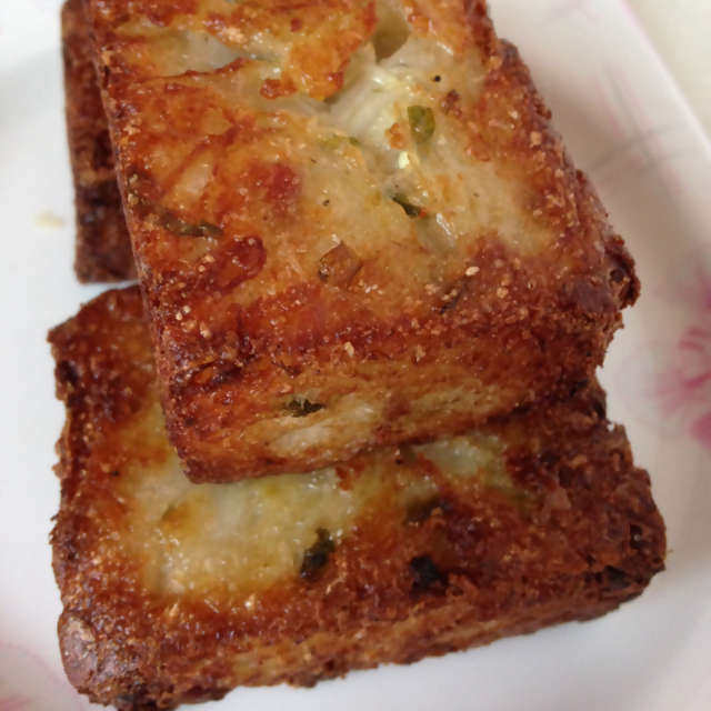 2:晾凉后切块不粘锅放比平常炒菜多一点的油煎至金黄盛出。