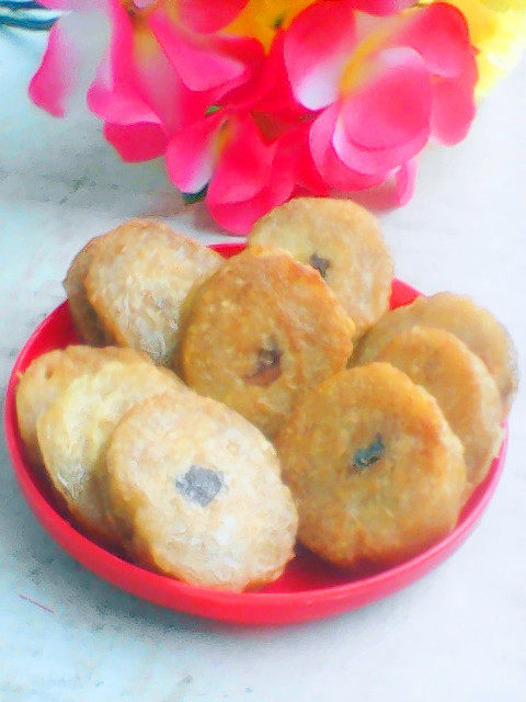 5:一片煎到微黄后,翻面再煎,多翻几次,煎到两面都是金黄色就可以了,趁热食用哦
