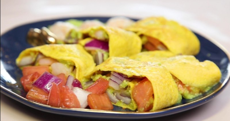 9:鸡蛋饼均匀的撒上黑胡椒、抹上牛油果泥,平铺上洋葱丁、西红柿丁和虾仁的混合物,从一端卷向另一端,营养健康的牛油果能量蛋卷就做好了。
