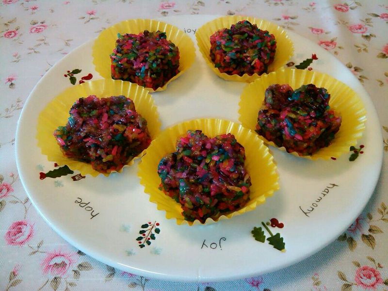 7:将五彩糯米饭装盘。好漂亮啊。