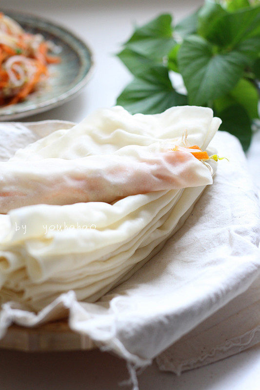 1.有不少烙饼都需要烫面或者半烫面,这样烙出来的饼冷热都柔软,但春饼非常薄,如果用开水和面,面团的筋度降低了,面皮就不容易擀薄,更达不到透明状;2.用高筋面粉会利于擀薄并呈现透明状,没有高筋面粉用中筋面粉也是可以的;一是中筋面粉中加少许盐增加筋度;二是面团饧的时间要长,越长越滋润,越容易擀薄,但要注意面团的环境不要温度过高,防止发酵;3.饼坯之间要抹植物油,起防粘的作用;另外擀的时候可以两张甚至多张摞在一起;4.蒸的春饼虽然有点费时,但是柔软;烙的饼省时,但是更有弹性和嚼劲儿,牙口不好的人最好用蒸的方法。