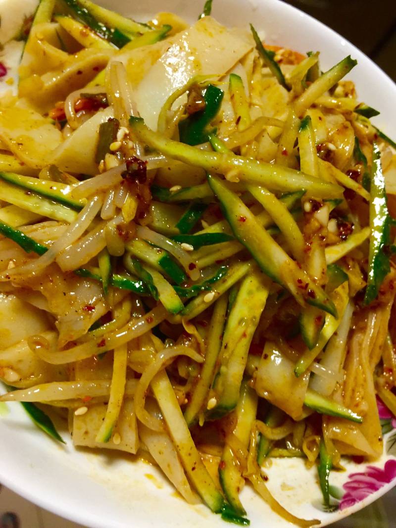 4:然后准备黄瓜,豆芽这些辅材,做油泼辣子,醋汤,芝麻酱,蒜汁,这些就可以调好开动了