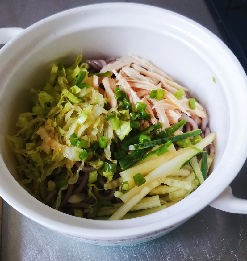 11:放入碗中,依次将黄瓜丝,鸡丝和生菜摆在荞麦面上,撒上葱花。